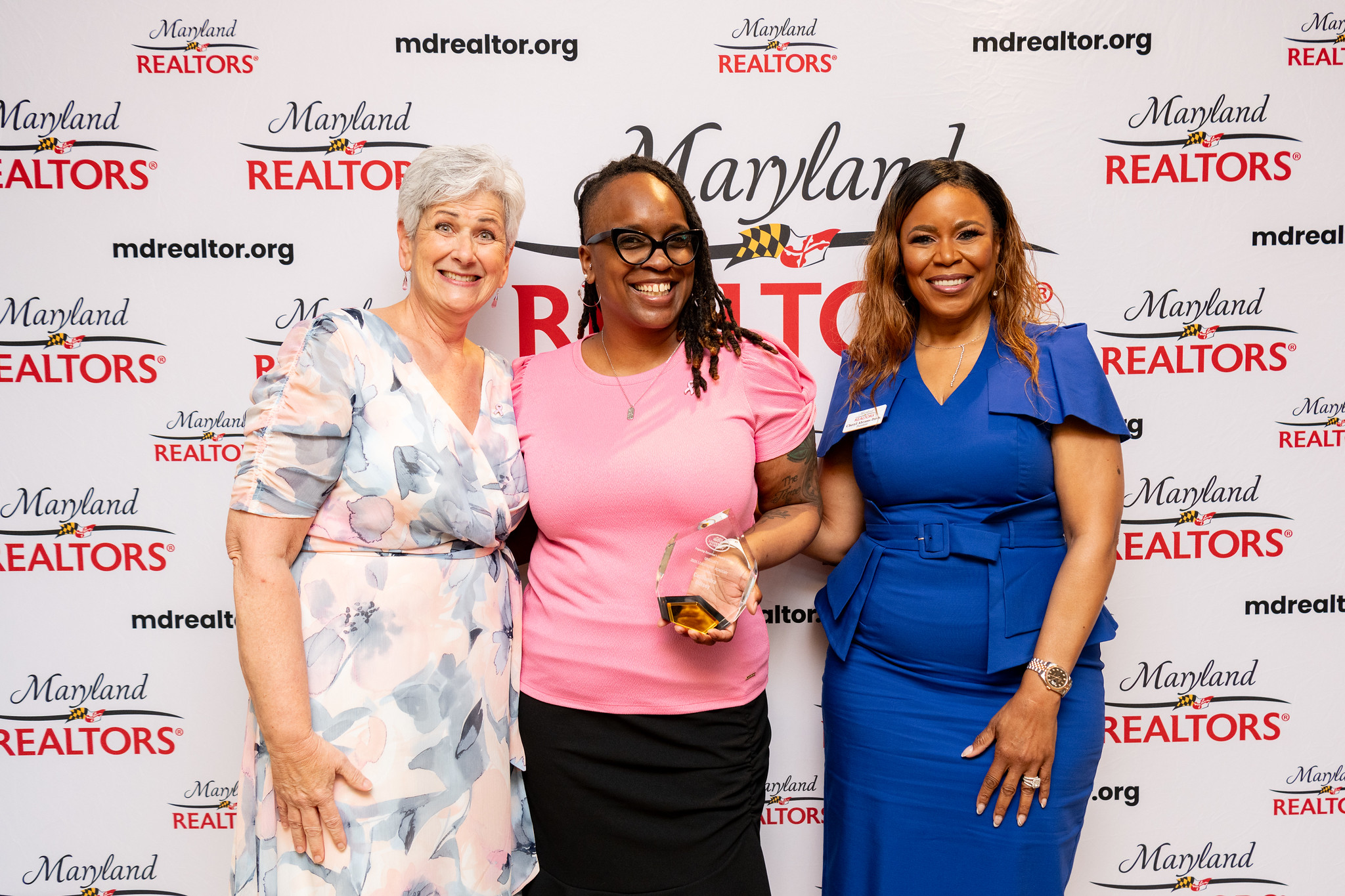 REALTOR® CasSandra Dorsey is honored at the 2025 Maryland REALTORS® Leadership Academy Graduation Ceremony. (From left) Jenn Klarman, President of the Leadership Academy Advisory Group; Dorsey; and Cheryl Abrams Davis, 2025 President of Maryland REALTORS®.