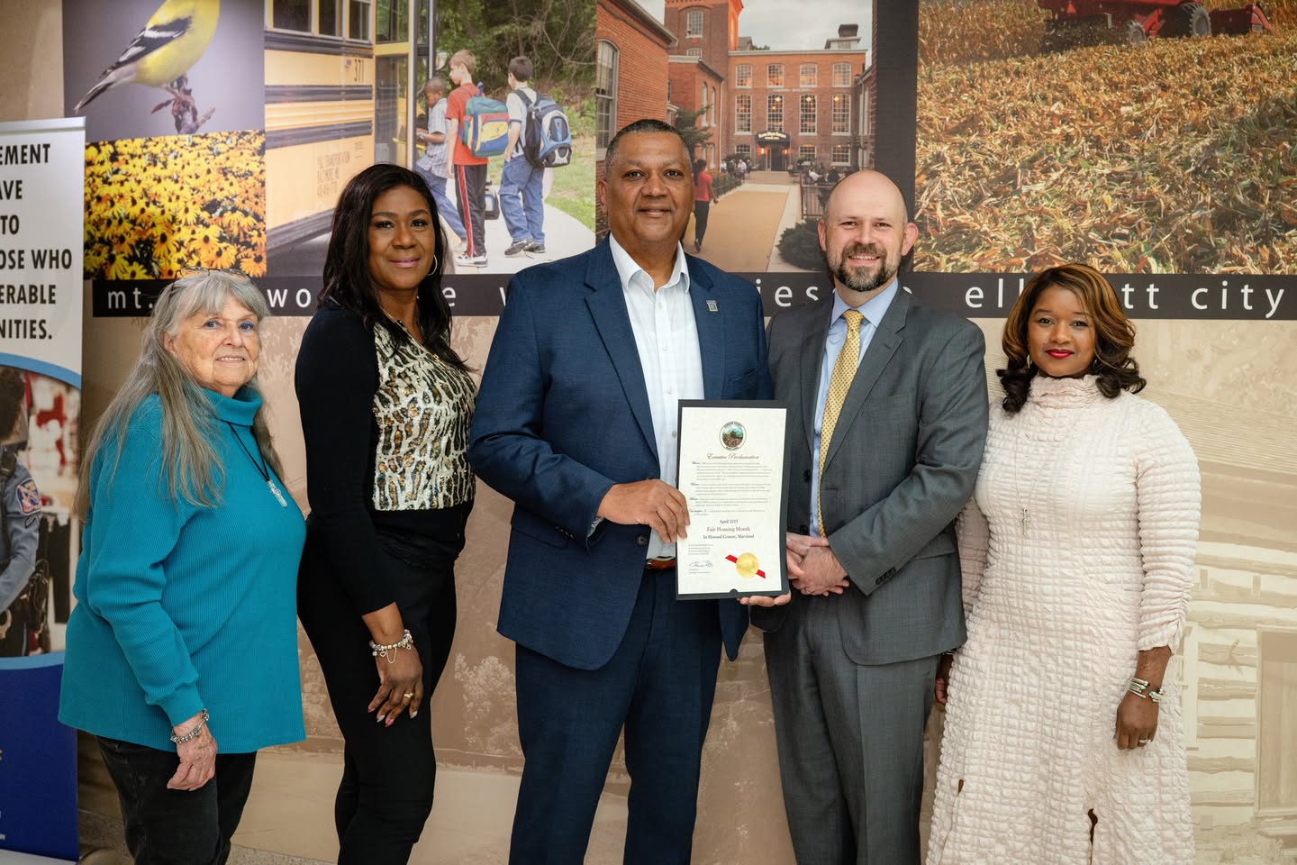 HCAR representatives are presented with a proclamation declaring April as Fair Housing Month in Howard County. (From left) Anne Cooke, REALTOR® and Fair Housing Committee Member; Michelle Williams, REALTOR® and Fair Housing Committee Vice Chair; Jimmie Jennings, REALTOR® and 2025 HCAR President; Brian Shepter, Deputy Chief of Staff for Howard County Executive Dr. Calvin Ball; and Joy Epps, REALTOR® and Fair Housing Committee Chair.