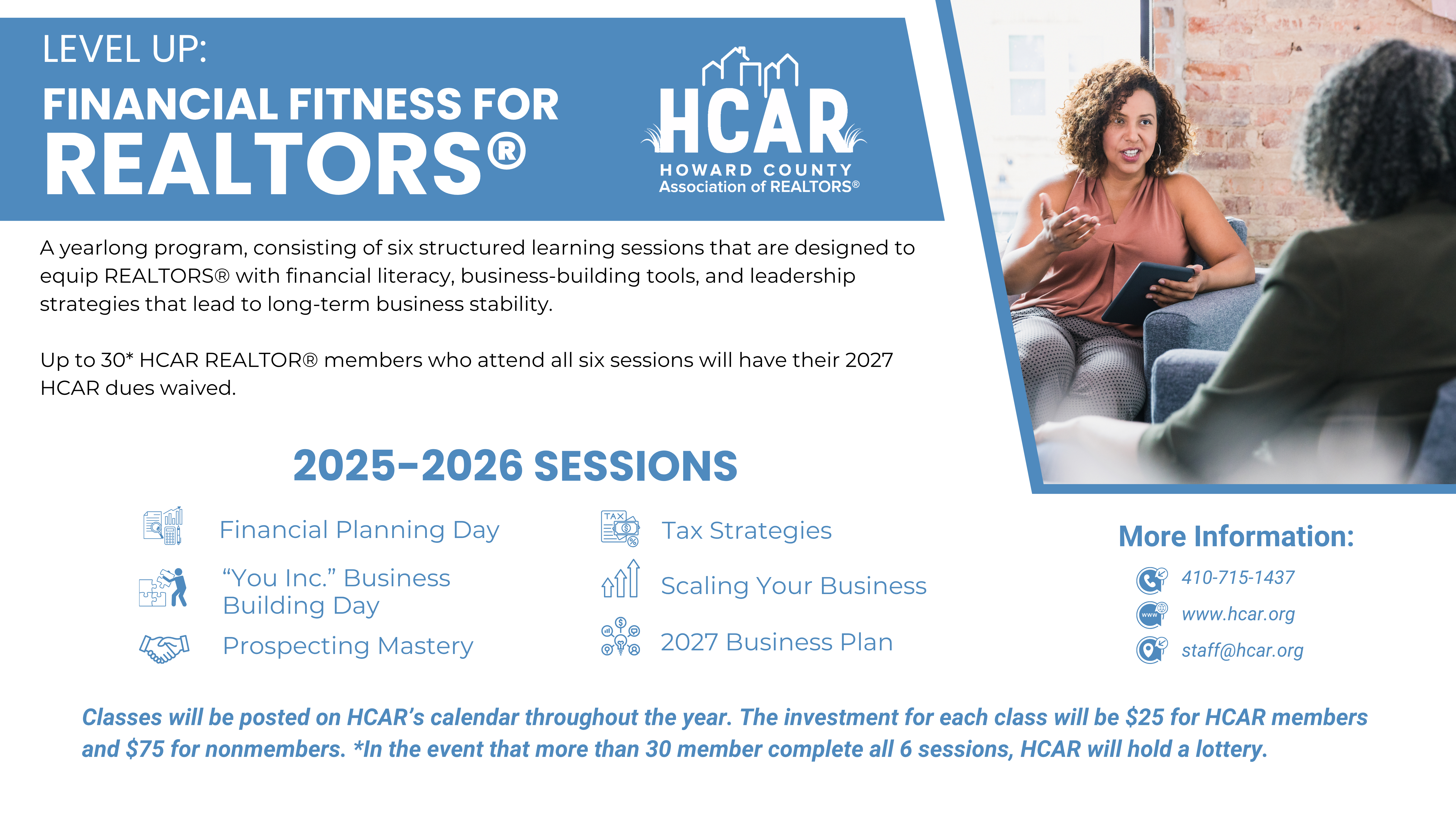 Completion Incentive: The first 30 REALTORS® who attend all six sessions will have their 2027 local association dues waived and be recognized at the Installation & Awards Event.